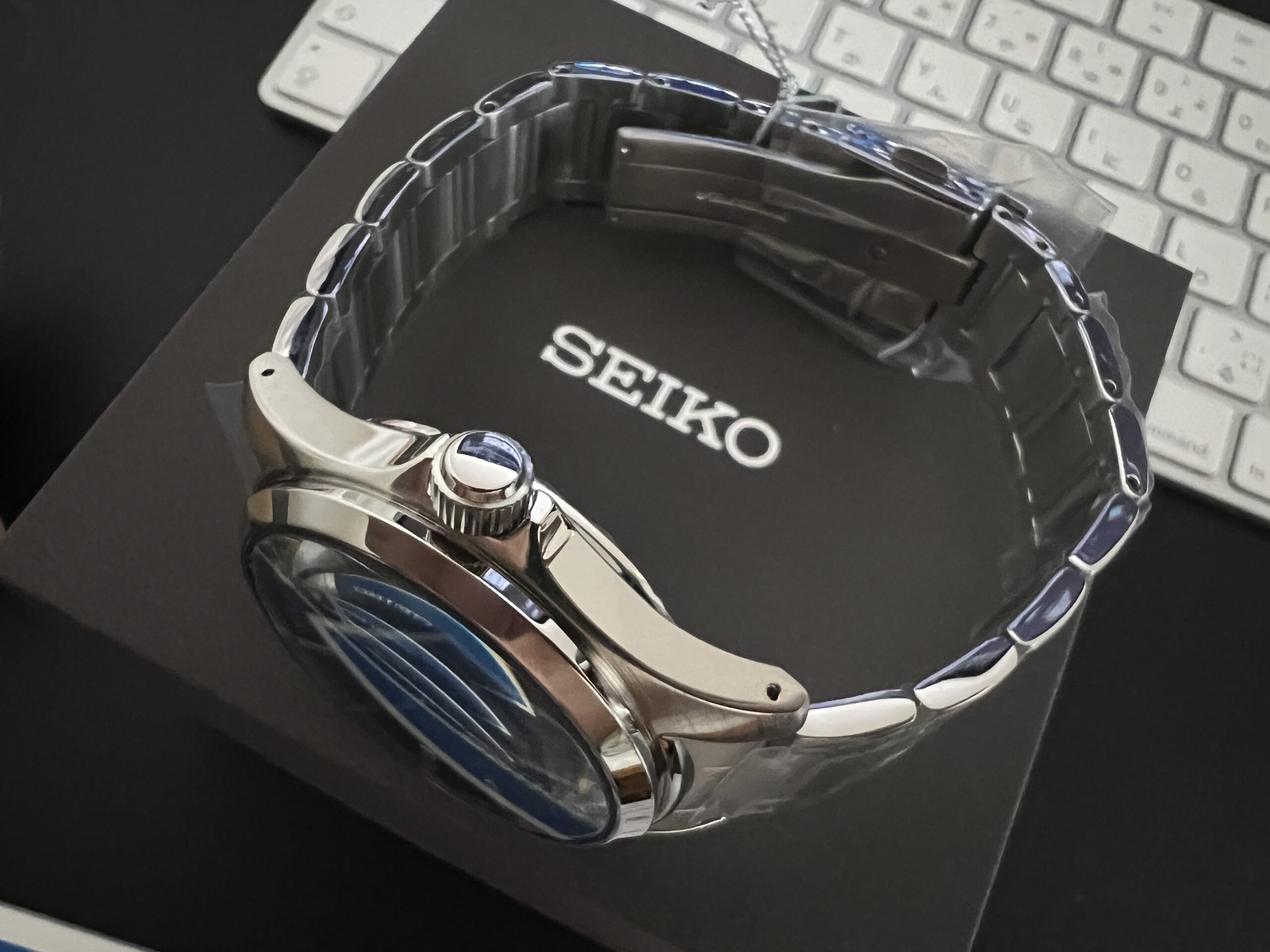 それでも、SZSB012は安っぽいギラついた仕上げの、いわゆる家電量販店のガラスケースの中で下品にギラギラ光る(好きだが)1万円台の3針クオーツ時計とは全然違って、ちゃんと高級感が出てますね。